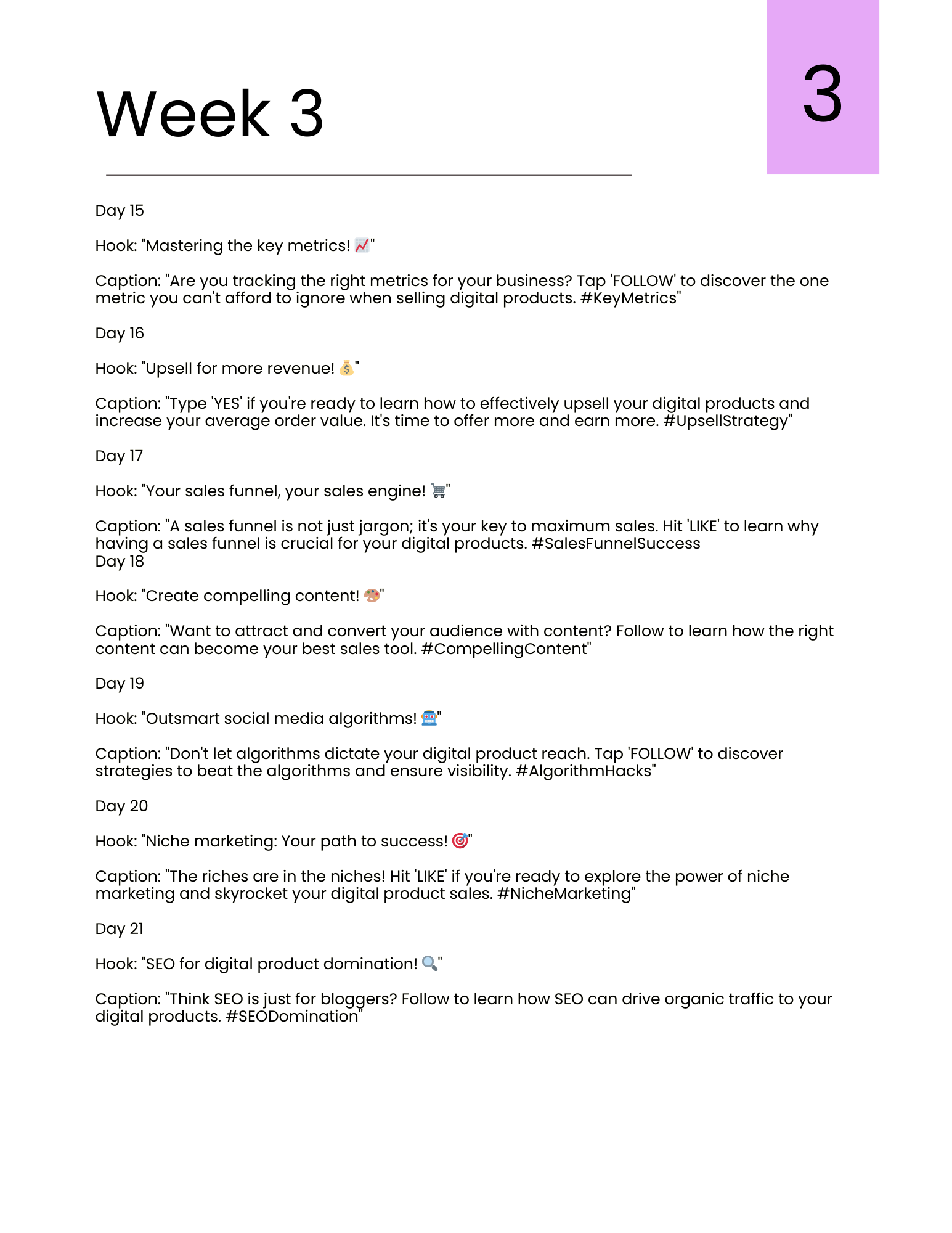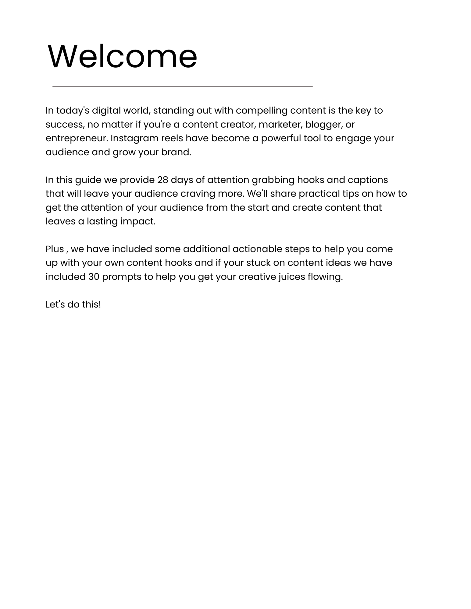 A 10-page guide that includes 28 days of ready-to-use hooks and captions for Instagram Reels, plus content idea prompts and brainstorming tools to boost engagement and creativity. Included in this guide are 28 days of Instagram hooks, captions + bonus prompts to boost content engagement.